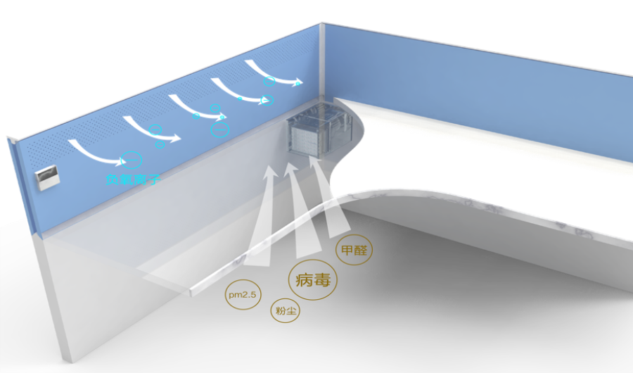 · 員工出入匯報工作,帶進來的病毒細菌粉塵異味等污染源;客戶交談吸煙帶來的pm2.5,煙味等都能有效去除,同時風口放置有無源生態級負氧離子材料,提高空氣質量,時刻沐浴在郊外園林。